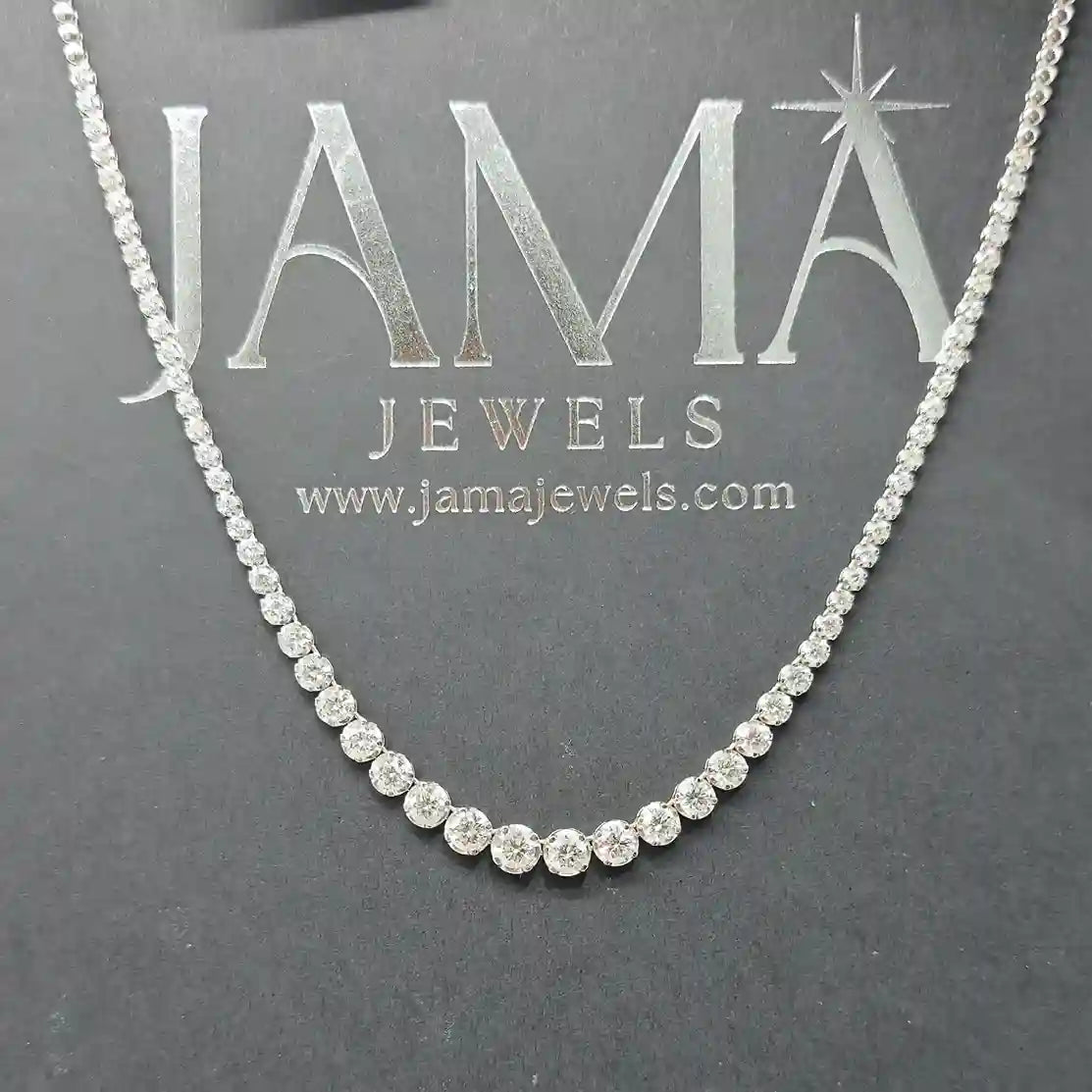 Experience the perfect harmony of brilliance and sophistication with the 5.40 CT Graduated Diamond Tennis Necklace (Ready for Delivery) from Jama Jewels. Crafted with precision, this timeless masterpiece features a seamless arrangement of lab-grown diamonds, gradually increasing in size to create a natural, flowing sparkle. Each diamond is hand-selected for clarity and brilliance, making it an exquisite statement of elegance. Whether for a special occasion or everyday luxury, this necklace embodies sustainable craftsmanship and modern refinement—ready to adorn you with effortless grace.