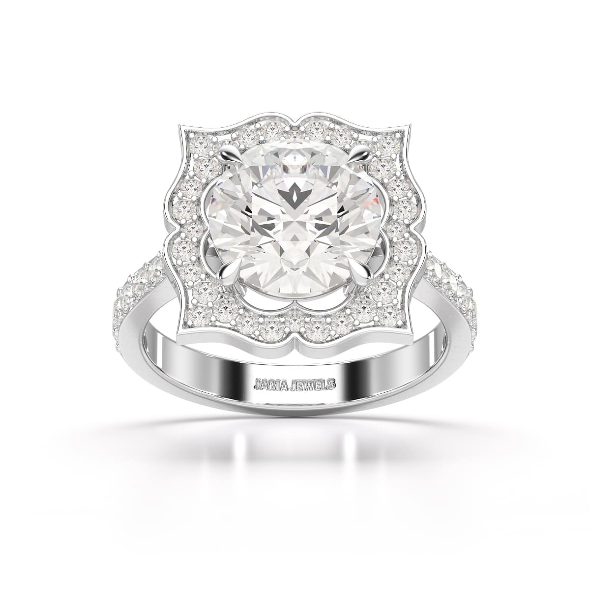 Illuminate your style with the 3.65 CT Lab Diamond Round Cut Flower Ring from Jama Jewels. This exquisite ring features a central round-cut lab diamond, expertly set to capture and reflect light with exceptional brilliance. Encircling the centerpiece is a unique floral arrangement of smaller diamonds, creating a stunning flower-like effect that enhances the overall sparkle and charm of the ring. Set in a beautifully crafted band, this design blends elegance with a touch of nature-inspired artistry, making it a perfect choice for engagements, special occasions, or as a statement piece that radiates sophistication and beauty.